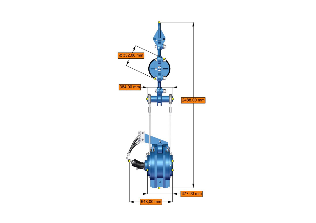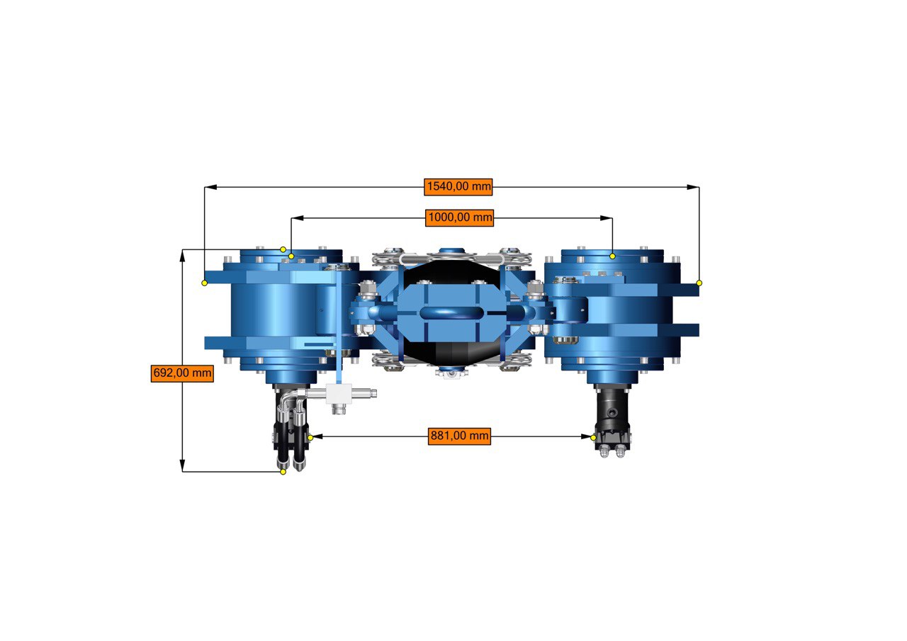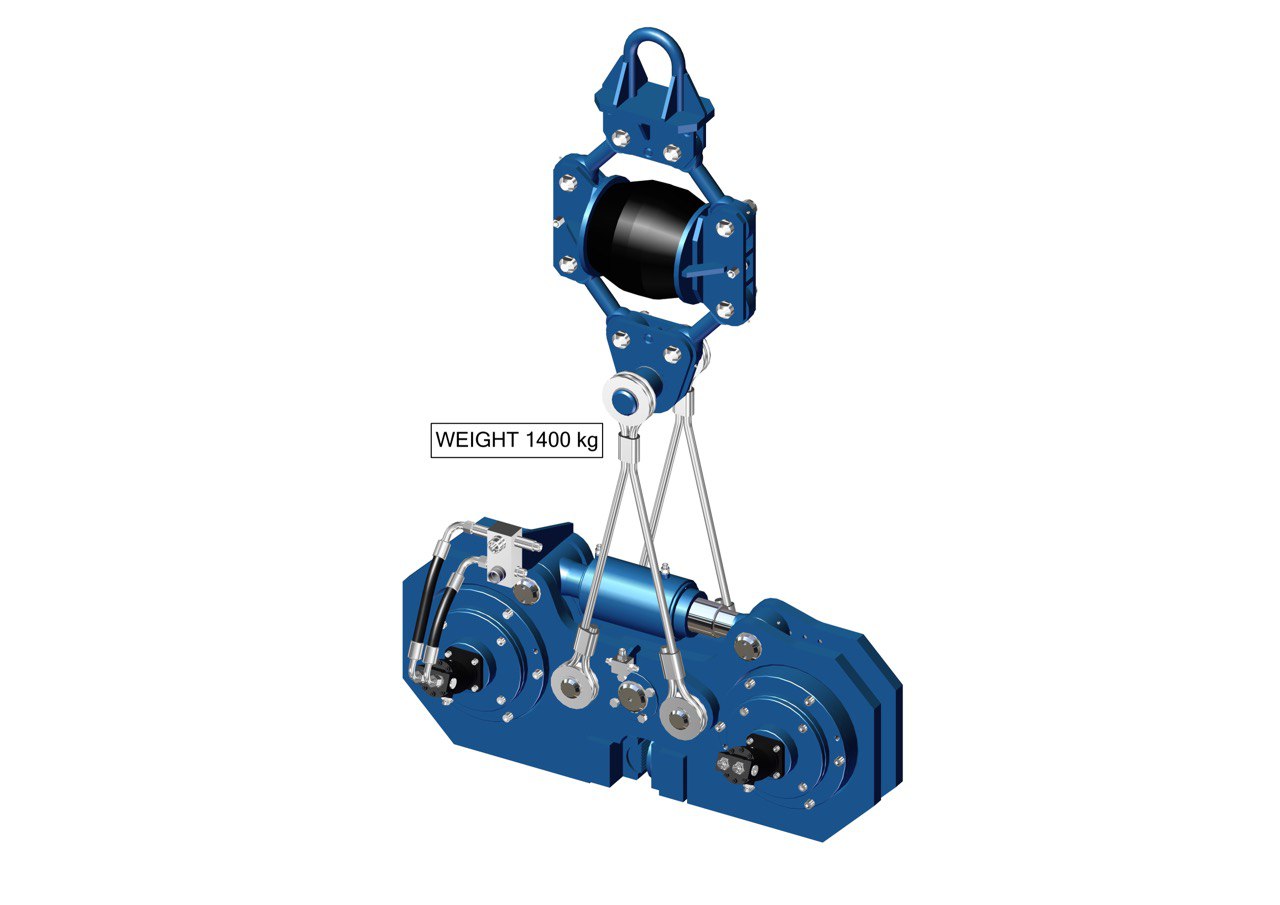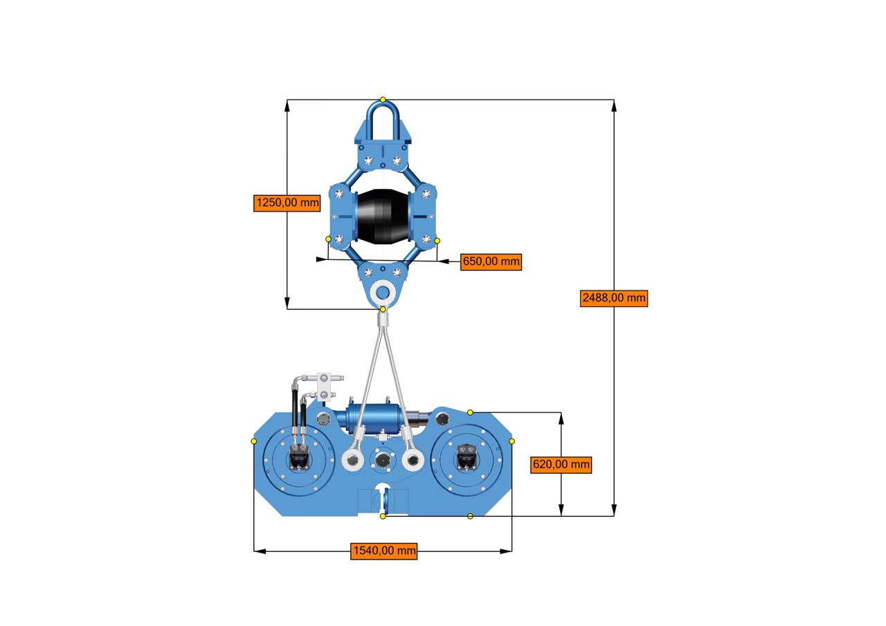 De klem bestaat uit twee afzonderlijke delen die door één hydraulische cilinder rond een centrale as bewegen.